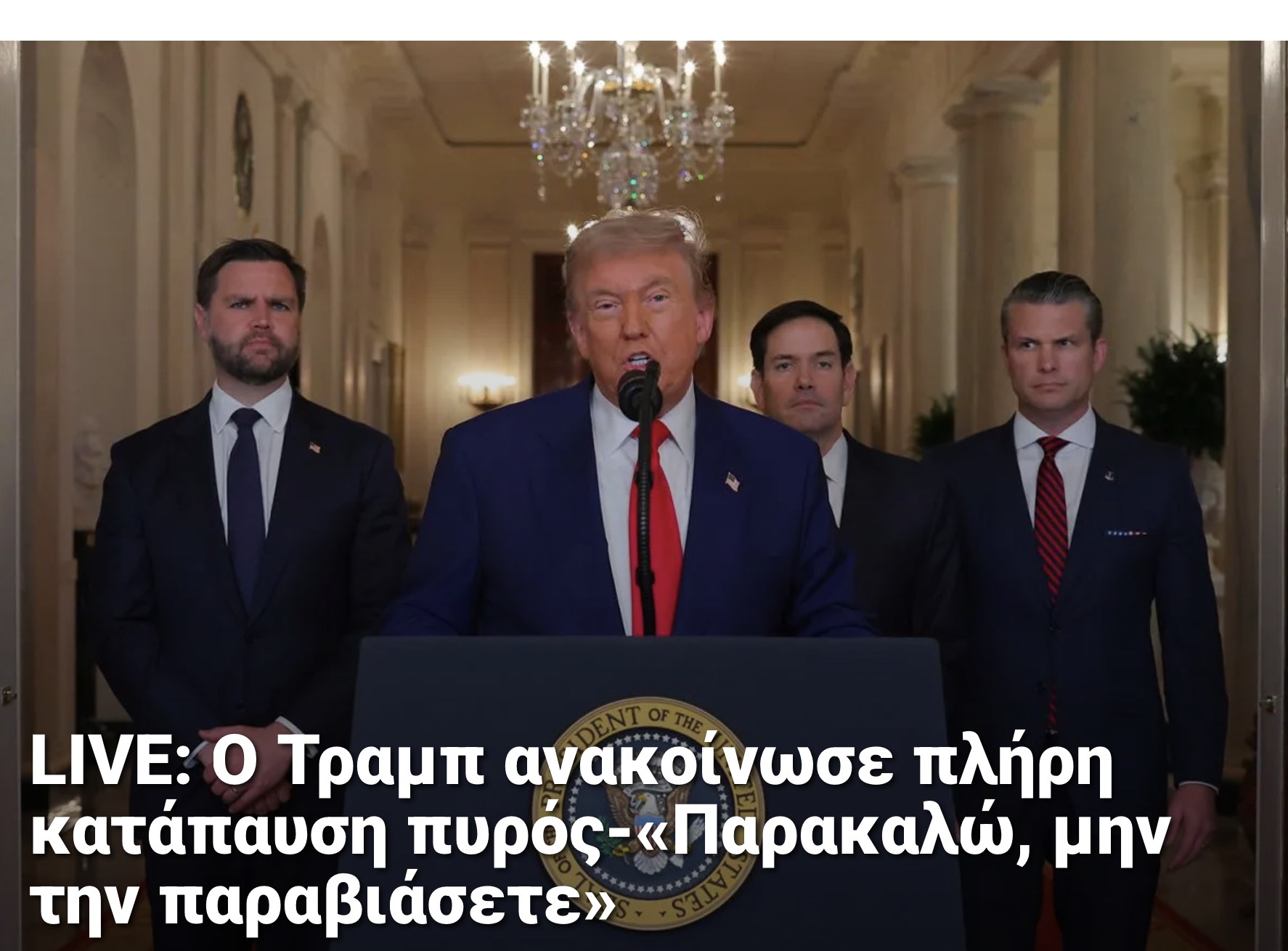 Ο Ντόναλντ Τραμπ ανακοίνωσε «πλήρη κατάπαυση πυρός» μεταξύ Ισραήλ και Ιράν από τις 7 το πρωί (ώρα Κύπρου). Ακολούθησαν, κατά τη διάρκεια της νύχτας, σφοδρές ιρανικές επιθέσεις στο Ισραήλ, με τουλάχιστον τέσσερις νεκρούς.