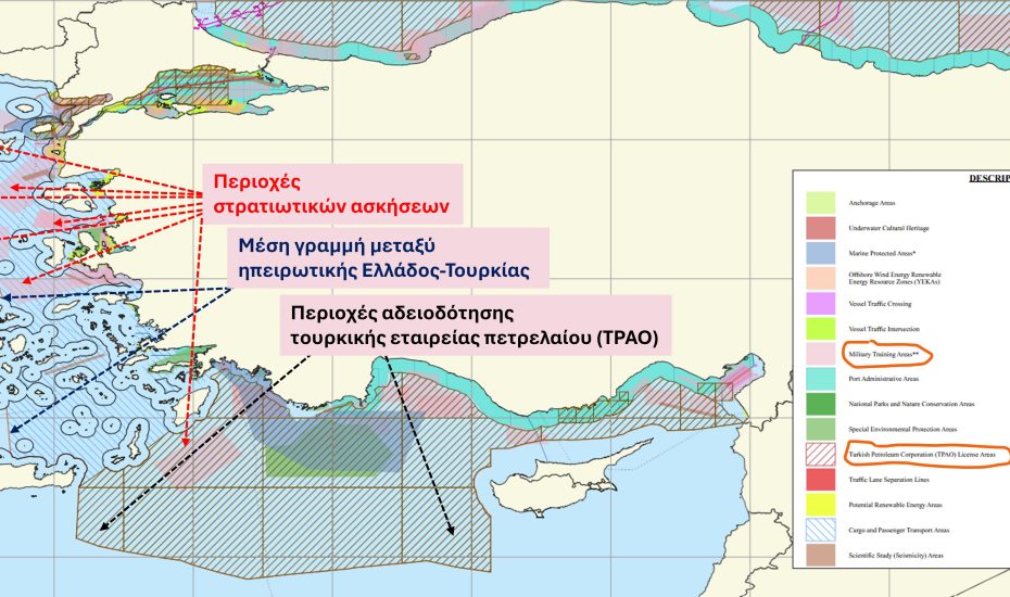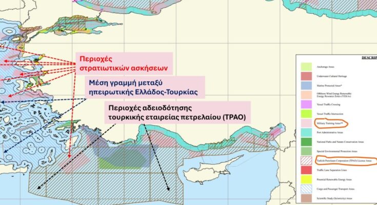 – Μία τεράστια περιοχή που αρχίζει ΝΑ της Κρήτης και φτάνει μέχρι τα δυτικά της Κύπρου η οποία ονομάζεται «περιοχή αδειοδότησης τουρκικής εταιρείας πετρελαίου (TPAO)». Δηλαδή παραχωρούν στην εταιρεία τους την περιοχή αυτή που επικάθεται στην δυνητική Αποκλειστική Οικονομική Ζώνη (ΑΟΖ) της Ελλάδος αλλά και της Κύπρου, για διεξαγωγή ερευνών και εξόρυξη υδρογονανθράκων.