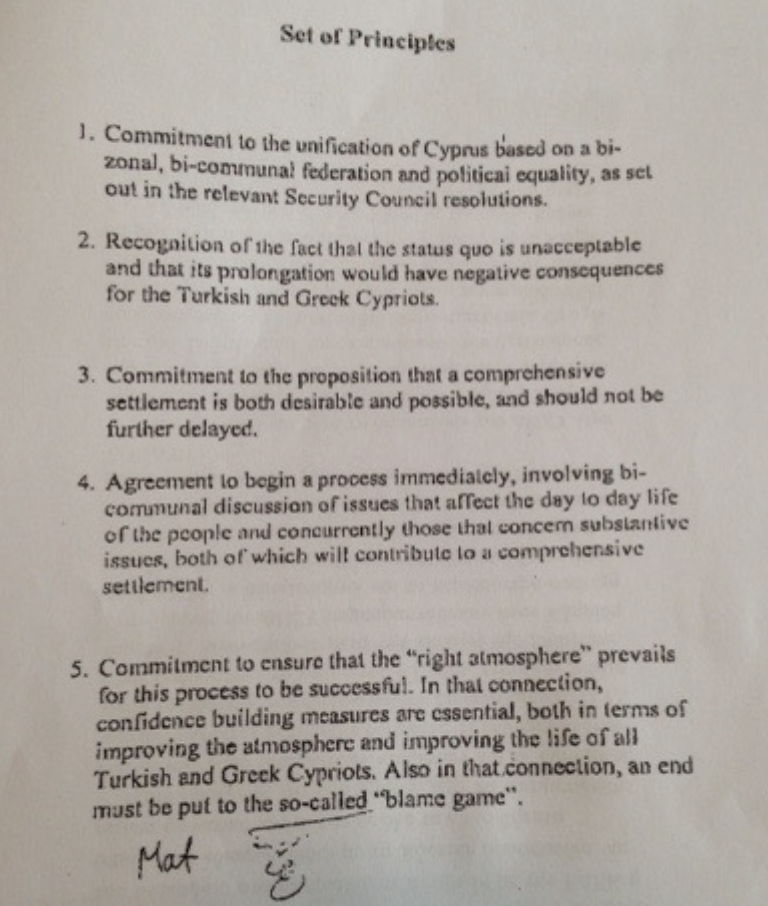 Και στις 8.7.2006 πριν πεθάνει, με την τραγική για τη χώρα του εμμονή, μονόγραψε με τον Μ. Α. Ταλάτ τη περιβόητη «Δέσμη Αρχών» για ΔΔΟ. Είναι το μόνο τέτοιο ανακοινωθέν που φέρει μονογραφή και η γράφουσα το βρήκε από το Αρχείο του ΟΗΕ.