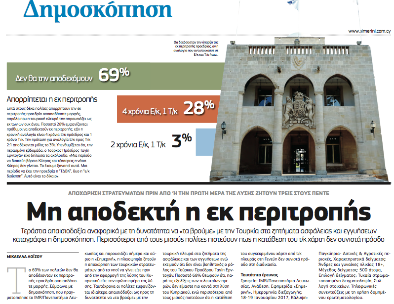 Το 69% των πολιτών δεν θα αποδέχονταν εκ περιτροπής προεδρία οποιασδήποτε μορφής. Σύμφωνα με δημοσκόπηση, που πραγματοποίησε το IMR/Πανεπιστήμιο Λευκωσίας και παρουσιάζει σήμερα και αύριο η «Σημερινή», η πλειοψηφία ζητούν η αποχώρηση των τουρκικών στρατευμάτων από το νησί να γίνει είτε πριν από την εφαρμογή της λύσης του Κυπριακού είτε την πρώτη ημέρα της λύσης.