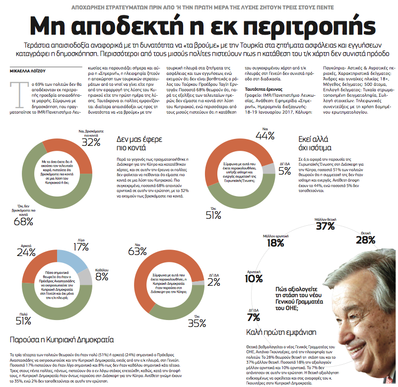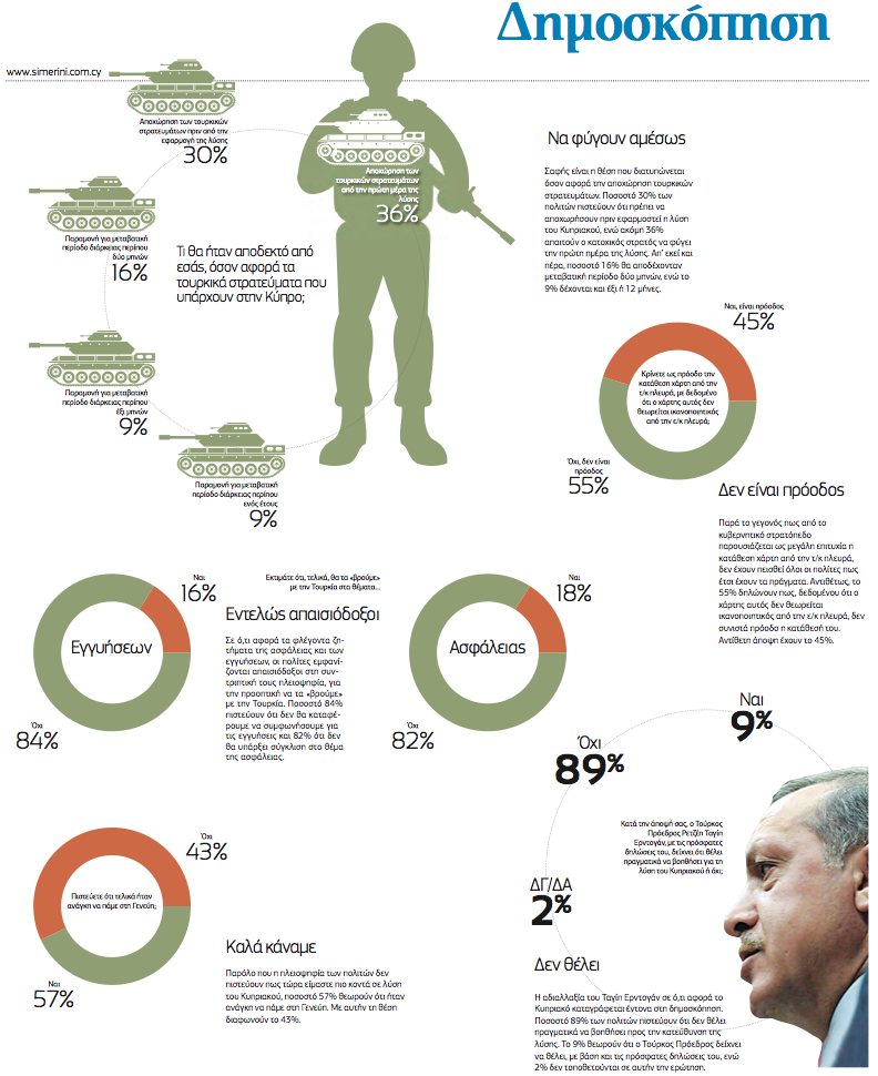 Ταυτόχρονα οι πολίτες εμφανίζονται ιδιαίτερα απαισιόδοξοι ως προς τη δυνατότητα να τα βρούμε με την τουρκική πλευρά στα ζητήματα της ασφάλειας και των εγγυήσεων, ενώ εκτιμούν ότι δεν είναι βοηθητικός ο ρόλος του Τούρκου Προέδρου Ταγίπ Ερντογάν. Ποσοστό 68% θεωρούν ότι, παρά τις εξελίξεις των τελευταίων ημερών, δεν είμαστε πιο κοντά στη λύση του Κυπριακού, ενώ περισσότεροι από τους μισούς πιστεύουν ότι η κατάθεση του συγκεκριμένου χάρτη από τ/κ πλευράς στη Γενεύη δεν συνιστά πρόοδο στη διαδικασία.