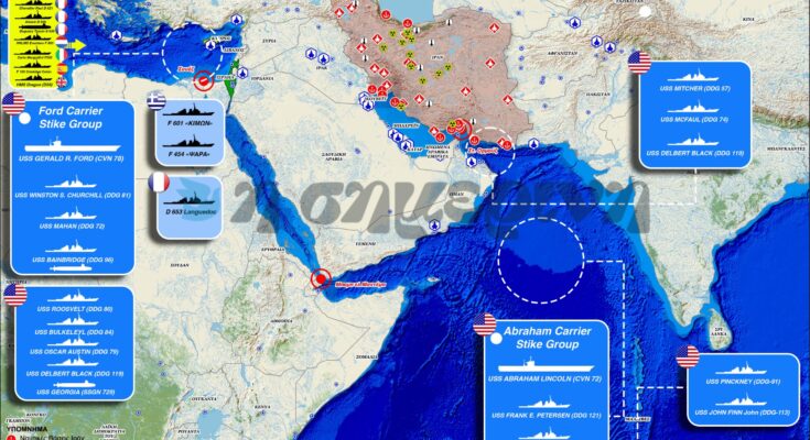 Ο χάρτης αυτός φωτογραφίζει τη συνολική διάταξη των Αμερικανών και άλλων δυνάμεων από τον Κόλπο ώς την Ανατολική Μεσόγειο. Πρόκειται για μια τρομακτική συγκέντρωση δυνάμεων και πυρός.