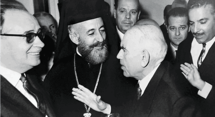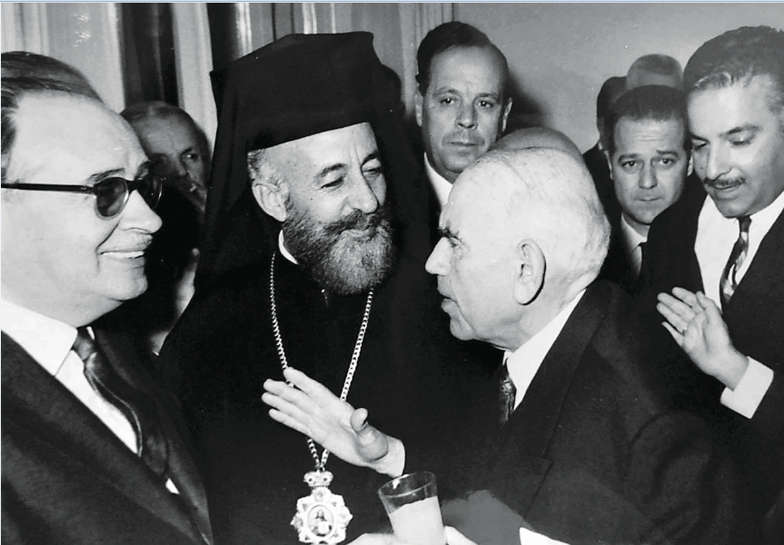 Ο Θεμιστοκλής Δέρβης συνομιλεί με τον Υπουργό Εξωτερικών της Ελλάδος Ηλία Τσιριμώκο και στο μέσο ο Μακάριος μειδιώντας.