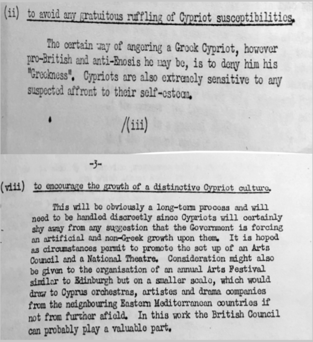«Αυτό θα είναι βέβαια, ένα βραχυπρόθεσμο σχέδιο και θα χρειαστεί να το χειριστούμε με διακριτικότητα, εφόσον οι Κύπριοι οπωσδήποτε θα απομακρύνονται από οποιανδήποτε εισήγηση που να λέγει πως η Κυβέρνηση τους επιβάλλει μίαν πλασματική και καθόλου Ελληνική ταυτότητα…Ένας σίγουρος τρόπος να εκνευρίσεις ένα Ελληνοκύπριο, ανεξάρτητα από το πόσο φιλο-Βρετανός και εναντίον της Ενώσεως μπορεί να είναι, είναι να του αρνηθείς τη «Ελληνικότητά του»…»